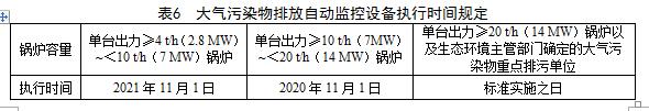 5.1.4 4t/h及以上蒸汽鍋爐、2.8MW及以上熱水鍋爐,以及生態環境主管部門確定的大氣污染物重點排污單位應安裝大氣污染物排放自動監控設備,并與生態環境主管部門聯網,bao證設備正常運行,執行時間見表6規定。