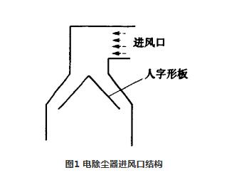 某公司4500W生產線窯頭采用的電除塵器進風口結構見圖1,由于除塵器壁板沒有保護裝置,大量含有熟料粉塵的氣流直接沖刷摩擦壁板,造成壁板受損嚴重。人字形導流板的主要作用是改變氣流的方向,但該人字形板氣體分流過于單一,氣料向兩側分流時造成除塵器壁板嚴重磨損。