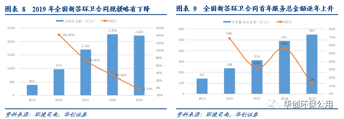 市場化解決供需痛點,_新簽環衛合同首年服務總金額逐年上升。在環衛市場化運營成為政府解決資金瓶頸、_民生、提高資金效率的_方式的背景下,環衛服務前期投入小,收益較穩定,可以類標準化運營,且可以有效提高企業技術實力和管理水平,企業進入意愿強烈。2019年_新簽環衛合同總規模略降2.4%至2223億元,但新簽環衛合同首年服務金額同比增長12%至550億元。