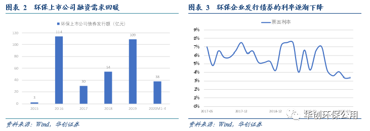 融資環境_助推環保企業融資規模擴大,同時融資成本降低。2019年以來放寬的“再融資新規”和穩健貨幣政策使環保企業的融資環境_預期逐步落地,環保上市企業在融資規模和融資成本方面均有所好轉。其中,環保上市公司的公司債自2017年大幅下滑后逐年回升,2019年發債總額升至109億元,同比增長102.23%。市場利率方面,自2017年逐年回落,由2017年的6.63%下降2019年的4.92%。短期融資規模方面,也整體呈現出上升趨勢。2019年,環保行業全年發行短期融資債券40億元,而2020年僅_季度便發行短期融資債券19.6億元,達2019年全年50%左右,對應市場利率也同樣維持低位,2020年一季度市場利率僅為2.42%,同比明顯降低,資金端的供給優化已經落地。