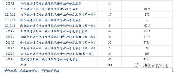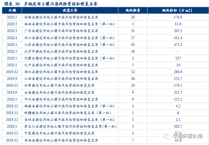 而自2019年年底起,各地方政府的配套政策密集且_落地,有望成為各地大力啟動修復工程的信號。截止2019年底,華北地區、西北和經濟發達地區均在土壤政策方面大力推進。2020年,山東、廣東、四川等部分省市發布具體土壤防治方案;而在操作層面上云南、上海、廣東等地已經出臺明確的修復流程操作要求。此外,截止2020年5月,_所有省級行政區已出臺土壤污染風險管控和修復名錄,累計需修復地塊554個,面積約5000萬m2。土壤修復名錄的出臺一方面意味著多省的土壤詳查已經轉移至工業場地領域,另一方面隨著土壤詳查的基本完成,行業進入修復周期,需求有望持續高增。