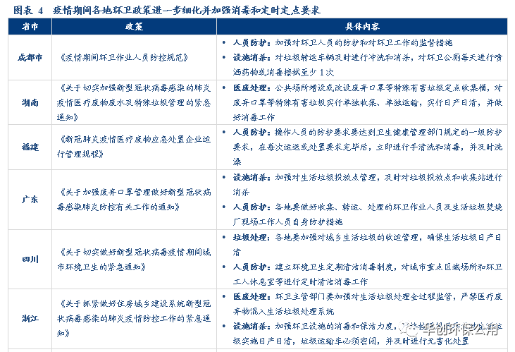 新冠疫情引發公眾對城市管理問題的廣泛關注,環衛服務市場有望實現進一步擴圍。疫情發生后,針對城市環衛管理方面凸顯的臟亂差等問題,_各省市陸續出臺一系列通知和規范文件,明確了環衛服務領域應對新型冠狀病毒肺炎疫情的工作方案。各項政策文件中分別在醫廢處理、日常垃圾清理、環衛設施消殺、公共環境消毒和環衛人員防護等領域提出了具體的要求,為社會各界應對新冠疫情提供了指導。對于環衛工作的_、精細化、_化的要求,無疑會加大對市政環衛部門工作的挑戰,有利于對_環衛公司及機構提供環衛服務的需求釋放,環衛服務市場化進程有望進一步加速。