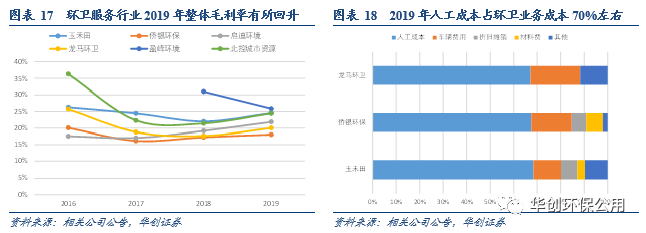 成熟項目占比提升推動2019年環衛毛利率回升,智慧化和機械化有望進一步提升盈利水平。由于早年磨合期項目逐步步入正常運營狀態,且新增項目占環衛服務整體的比例逐步減小,因此2019年行業整體盈利能力有所回升。而從長期來看,由于人工成本在環衛業務總成本中占比較大,因此環衛業務總成本對員工薪酬變動較為敏感,因此進一步實現智能化、網絡化有望提高環衛服務工作效率和效果,降低運營成本。
