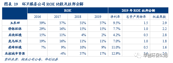 進一步對環衛企業進行杜邦分解分析,我們發現業務結構影響下的周轉效率是影響企業ROE的_重要因素。6家環衛企業中玉禾田“一枝獨秀”,近四年ROE均_過30%。對環衛企業的ROE進行杜邦分解,我們發現玉禾田凈利率處于行業中游,但較高的總資產周轉率(近四年總資產周轉率為2.5/2.1/1.7/1.5)反映玉禾田較高的運營效率,從而支撐高ROE;僑銀環保業務結構和資產結構與玉禾田相似,但其總資產周轉率從2016年的1.7下降至2019年1.0,運營效率未跟上公司擴張速度從而降低了ROE水平。啟迪環境、龍馬環衛、盈峰環境和北控城市資源資產結構偏重,總資產周轉率基本低于1.0,因而ROE偏低。從權益乘數的角度分析,玉禾田與僑銀環保自2016年來權益乘數快速增長,表明公司通過提高財務杠桿支撐其業務快速擴張,同時不能忽略提高杠桿率帶來的財務風險。