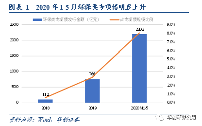 在政府專項債投入方面,地方政府受投向政策影響,2020年明顯轉向環保。2018年政府發行涉及環保類別的專項債券112億元, 2019年政府發行涉及環保類別的專項債券766億元,同比增長583%。由于2019年9月國常會決議2020年提前下達專項債禁止投向土儲等房地產項目影響,2020年投向重心明顯改變,2020年1-5月環保方向專項債券已招標發行額2202億元,占總發行專項債券8.1%,總金額和占比已經大幅_過2019年全年水平。同時2020年4月中共中央政治局強調積極擴大有效投資,加強傳統基礎設施和新型基礎設施投資,考慮到傳統基建的托底作用,以及環保投資的民生意義,行業發展活力有望進一步被激發。