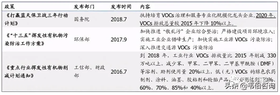 2016年12月,國務院印發(fā)《“十三五”生態(tài)環(huán)境保護規(guī)劃》。要求控制重點地區(qū)重點行業(yè)揮發(fā)性有機物排放,全面加強石化、有機化工、表面涂裝、包裝印刷等重點行業(yè)揮發(fā)性有機物控制,其中包括鋼鐵行業(yè)、建材行業(yè)、石化行業(yè)、有色金屬行業(yè)等,_排放總量下降10%以上。