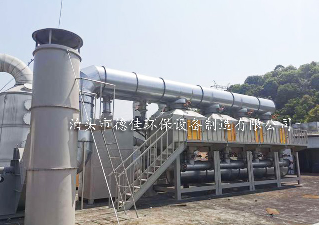 催化燃燒設備的干式過濾,將廢氣中顆粒狀污染物截留去除,然后進入吸附床進行吸附,利用具有大比表面積的蜂窩狀活性炭將有機溶劑吸附在活性炭表面,經處理后的潔凈氣體經過風機、煙囪高空排放。活性炭經過吸附運行一段時間后達到飽和,啟動系統的脫附-催化燃燒過程,通過熱氣流將原來已經吸附在活性炭表面的有機溶劑脫附出來,這些脫附下來的VOCS有機廢氣,濃度是原來的幾十倍甚至幾百倍,這些濃縮后的VOCs有機廢氣在風機的帶動下進入催化燃燒氧化爐內,并經過催化燃燒反應轉化生成CO2和水蒸氣等無害物質。催化燃燒反應是放熱反應,反應產生的熱量經過熱交換部分回用于活性炭的脫附再次重生,