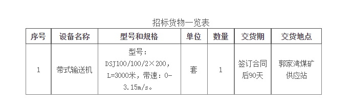 2.1 項目概況、招標(biāo)范圍及標(biāo)段(包)劃分:本項目招標(biāo)范圍包括帶式輸送機(jī)的供貨、運輸及相關(guān)服務(wù)。(具體標(biāo)包劃分、交貨時間、交貨地點及設(shè)備名稱、技術(shù)規(guī)格、數(shù)量等技術(shù)參數(shù)見《招標(biāo)貨物一覽表》)
