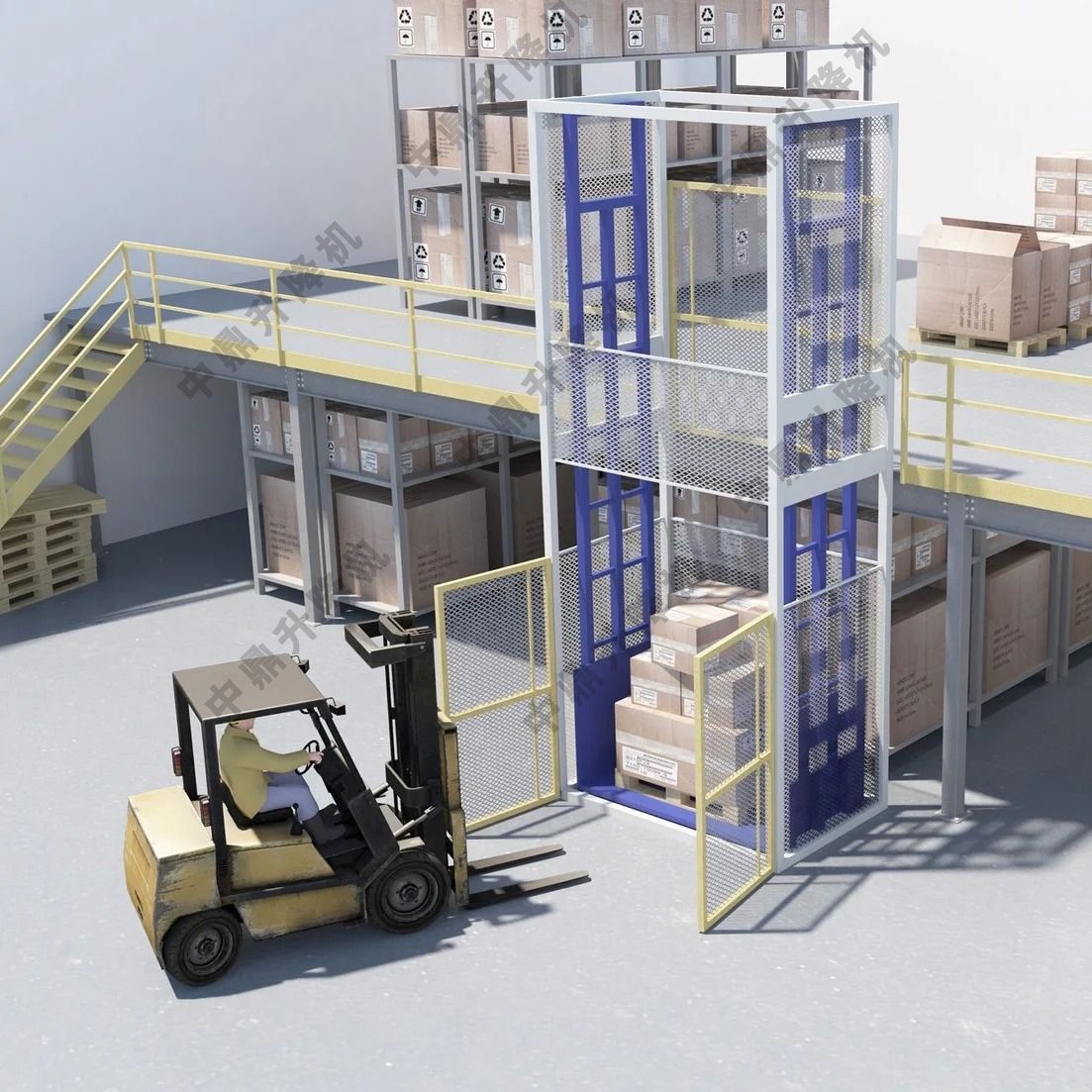 • 工作場景:圖中展示了叉車將貨物送入貨梯平臺,貨梯通過導軌和液壓系統將貨物平穩輸送至上層平臺,實現高效的貨物轉運。