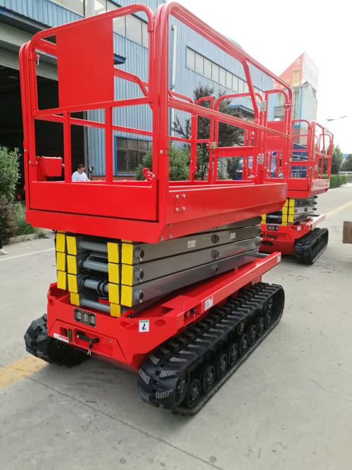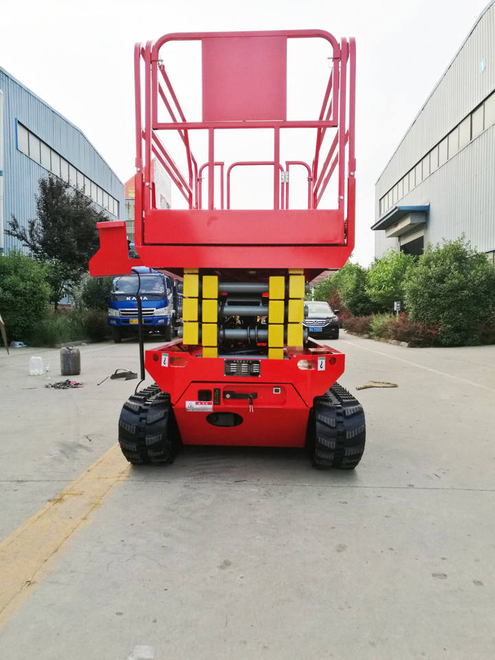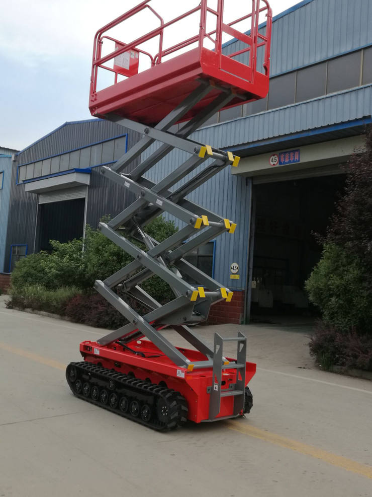 履帶式液壓升降平臺采用加重底盤,工作時,不需要支腿,在升降機升起后,不需要不把升降機收起即可行走,提高了工作效率,同時,它的履帶式車輪,增加了與大地接觸的面積,在野外泥濘道路上也可行走和工作,是石油勘探、野站部隊通信線路安裝施工等野外高空作業的理想設備。